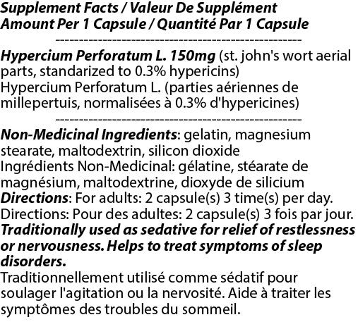Ingredients: Hypercium Perforatum L. (st. john's wort aerial parts, standarized to 0.3% hypericins) 150mg