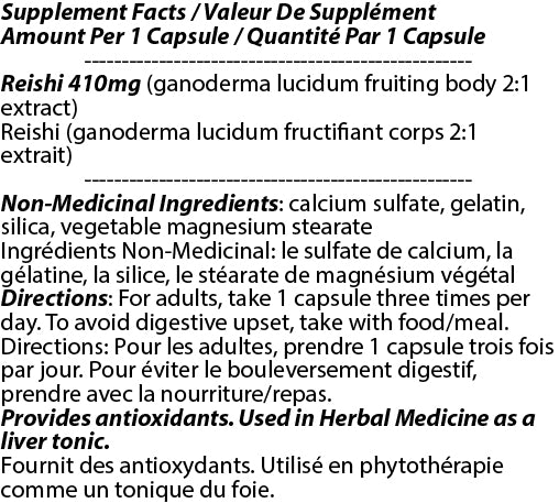 Ingrédients : Reishi (ganoderma lucidum fructification 2 ::1 extrait) 410mg